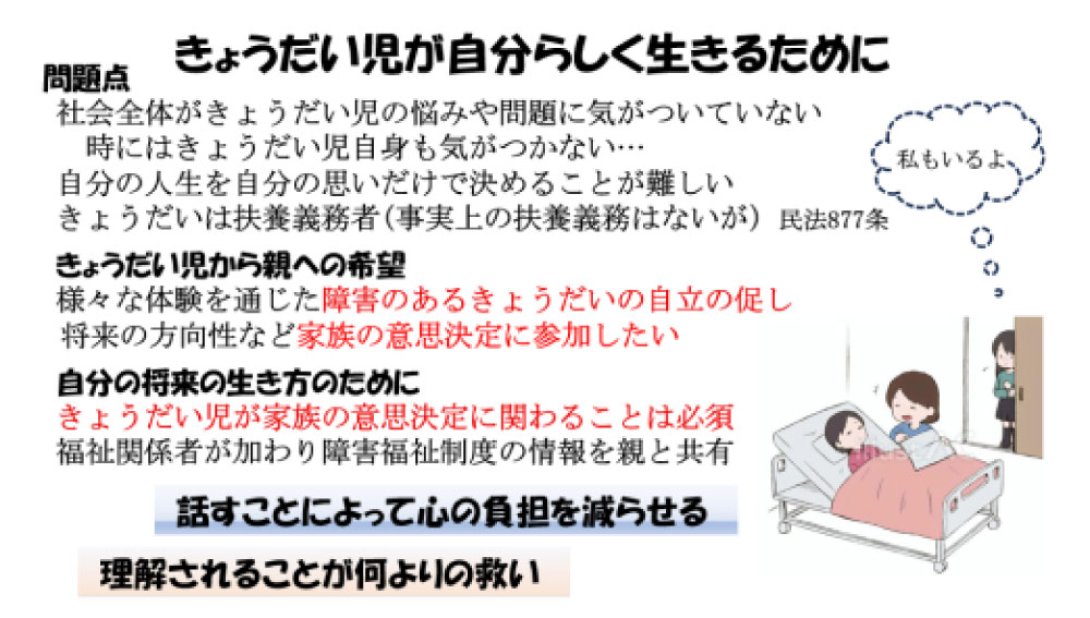 民法第877条では、直系血族および兄弟姉妹は互いに扶養をする義務があると定められていますが、きょうだい児には事実上の扶養義務は必ずしもありません。しかし、きょうだい児が自分に関わるかもしれない事について意思決定に関わることができないことは問題です。さらに障害児本人も希望を代弁してもらえるように話し合いに参加することは一人の人間としての権利です。