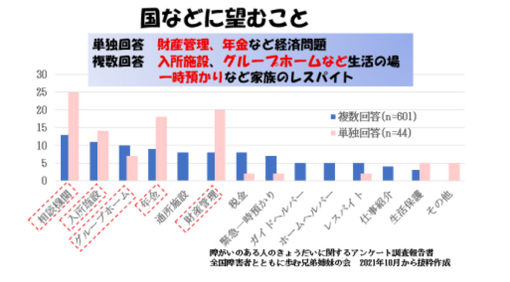 相談機関に次いで望まれているのは、単独回答では、障害のあるきょうだいの財産管理と年金などお金に関することです。年金、財産管理等は「障害者の自立」に向けて、家族の負担を軽くするために不可欠で、福祉サービスを利用するため、これからは成年後見制度の利用が求められています。
