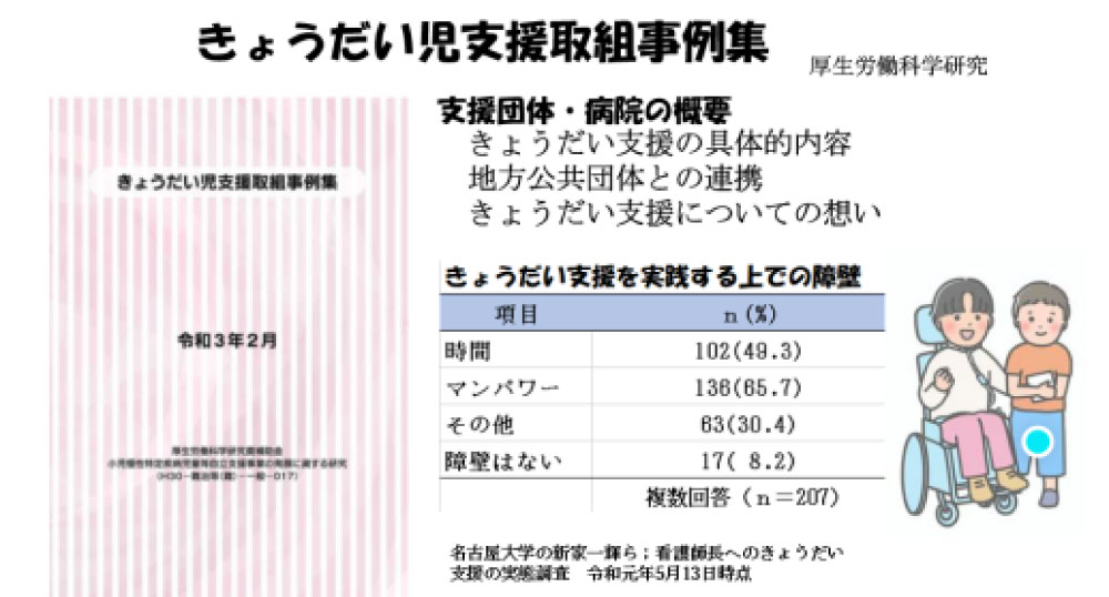 連携してきょうだい支援に取り組みつつあります。令和3年2月に厚生労働省では科学研究成果として、小児慢性特定疾病児童、医療的ケア児、発達障害児者のきょうだい児支援取組事例集の報告がされています。この中で44支援団体、6病院の取組みが紹介され、きょうだいを対象としたレクリエーションやお茶会などの集まりの場の設定などについて報告されています。